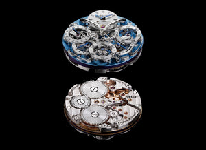 Completely independent dual time zones displayed on two dials; unique vertical power reserveLeft crown at 8 o'clock for setting time of left dial; right crown at 4 o'clock for setting time of right dial and winding