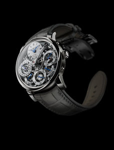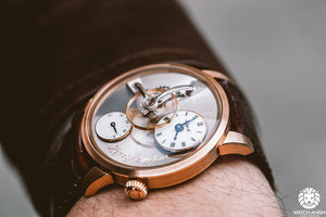The main features of Legacy Machine No.1 are the large 14mm “flying” balance wheel, its one-of-a-kind vertical power reserve indicator and the completely independent dual time zones.